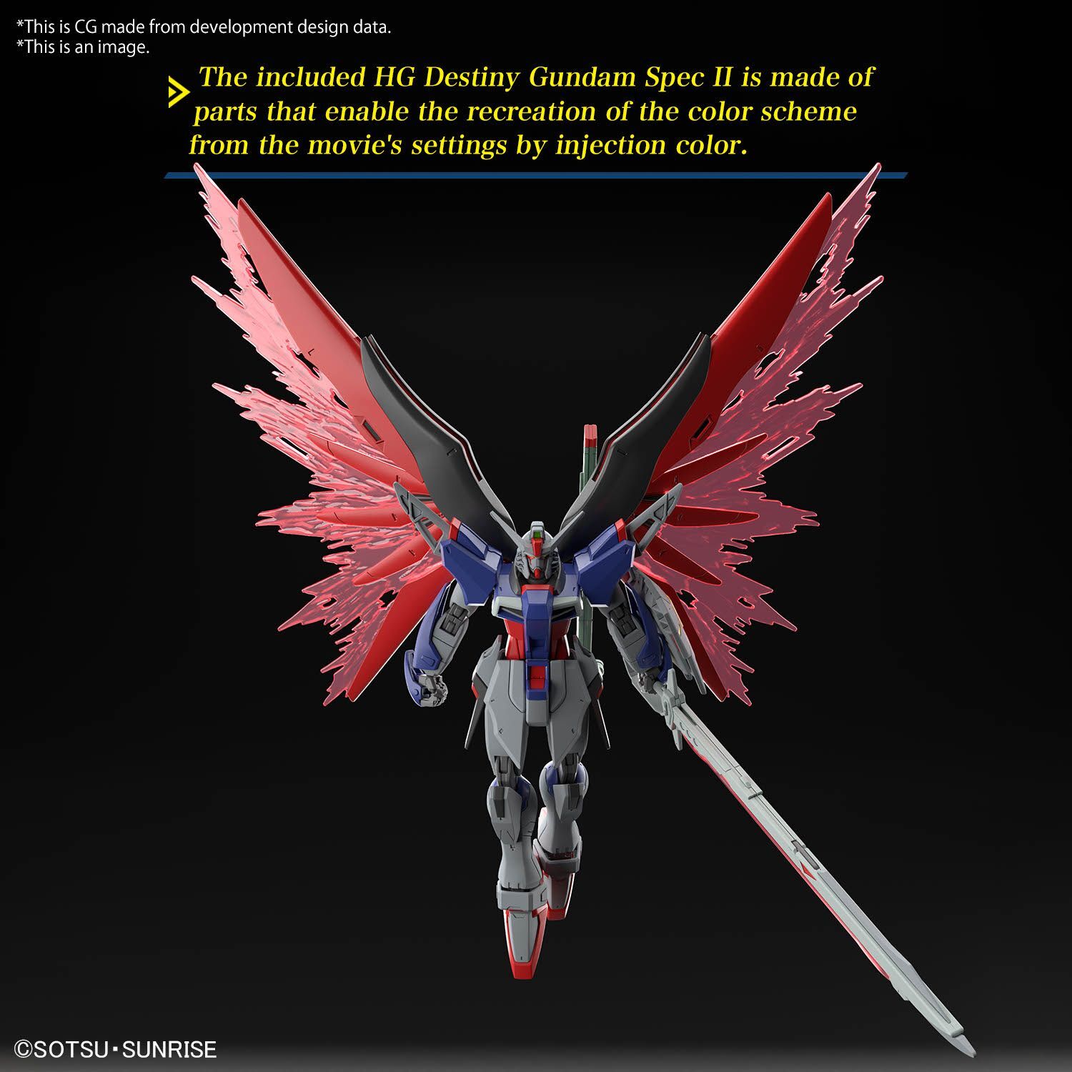 The Destiny Gundam Spec II now joins Bandai's "HG (High Grade)" model-kit series, together with its super-large armament, the Zeus Silhouette! The Zeus Silhouette can also transform into a standalone MA form. It'll be over 50cm long, and can be displayed on the included action base. The hatches on the back and legs of the Zeus Silhouette can be opened and closed, and you can recreate the exposed state of the missile warhead with parts replacement. The HG Destiny Gundam Spec II is molded in color; clear molded parts such as the Wings of Light, effect parts for the Palma Fiocina, beam shield, and beam boomerang are also included. Weapons for the Destiny Gundam are also included, such as the Arondight beam sword and the high-energy long-range beam cannon.